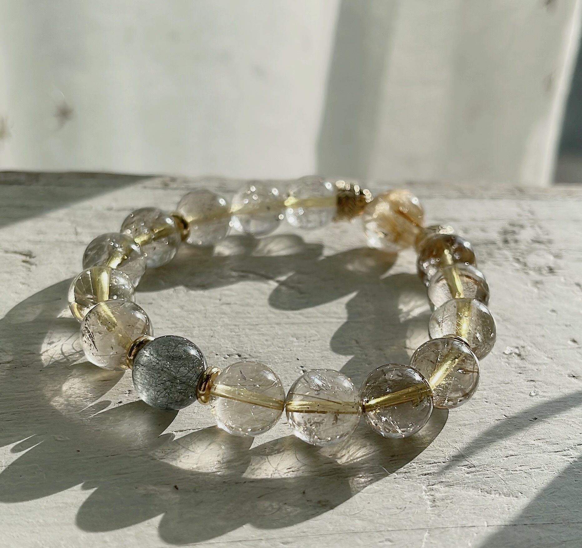 トップにたくさん金の針が入った高品質ルチルクォーツを使った金運•仕事運アップブレスです♪